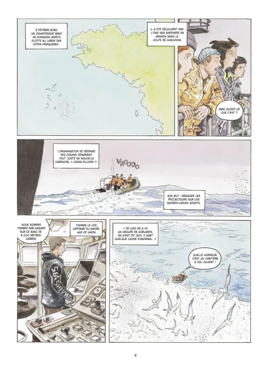 La BD documentaire est plus que jamais nécessaire à notre époque, celle de Maxime de Lisle et Olivier Martin pointe du doigt un des enjeux majeurs de la crise écologique, la mer et l'exploitation de ses ressources. Les auteurs se focalisent surtout sur la France et les mers qui bordent ses côtes et qui ont été vidées de 80% de leurs poissons de fond. Qui les a mangés ? Devinez...